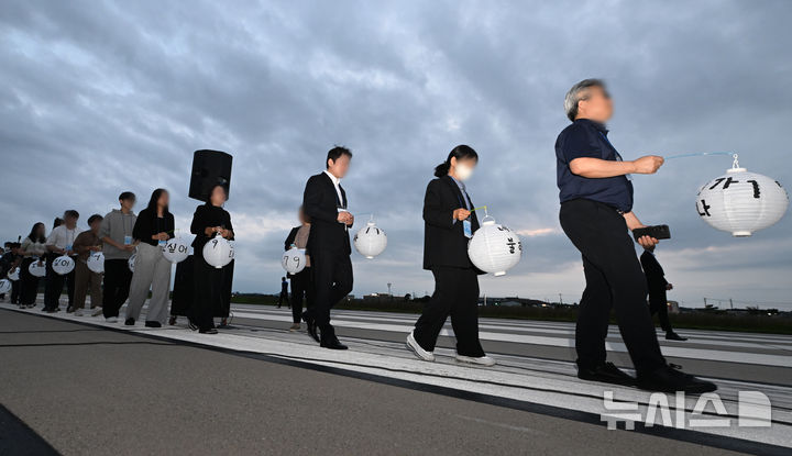 [무안=뉴시스] 이영주 기자 = 추석 당일인 6일 오후 전남 무안군 무안국제공항 활주로에서 12·29 무안공항 제주항공 여객기 참사 유가족협의회가 참사 희생자들의 넋을 위로하며 '기억의 활주로, 별이 된 당신께' 유등행사를 진행하고 있다. 2025.10.06. [email protected]