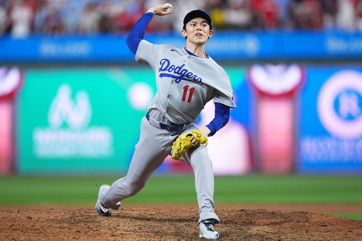 [필라델피아=AP/뉴시스] 로스앤젤레스(LA) 다저스의 사사키 로키가 6일(현지 시간) 미 펜실베이니아주 필라델피아 시티즌스 뱅크 파크에서 열린 2025 메이저리그 내셔널리그 디비전시리즈(NLDS·5전3선승제) 2차전 필라델피아 필리스와의 경기 9회 말 투구하고 있다. 사사키는 팀이 4-3으로 쫓기던 9회 말 2사 1,3루 상황에서 마운드에 올라와 팀 승리를 지켜냈고 다저스가 내셔널리그 챔피언십시리즈(NLCS·7전4선승제)에 1승만을 남겨뒀다. 2025.10.07.