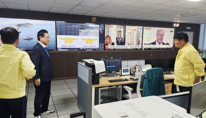 [무안=뉴시스] 박기웅 기자 = 김영록 전남도지사가 7일 오후 추석 연휴 종합대책 상황실을 방문해 사건사고 대응 상황을 점검한 뒤 근무 중인 직원들을 격려하고 있다. 김 전남지사는 이날 직원들에게 남은 연휴 기간 도민의 안전과 편안한 명절을 위해 최선을 다해줄 것을 당부했다. (사진 = 전남도 제공) 2025.10.07. [email protected]