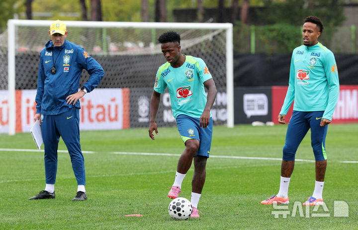 [고양=뉴시스] 김선웅 기자 = 대한민국 축구대표팀과 평가전을 앞둔 브라질 축구대표팀의 비니시우스가 7일 경기 고양시 고양종합운동장 보조경기장에서 훈련을 하고 있다. 2025.10.07. [email protected]
