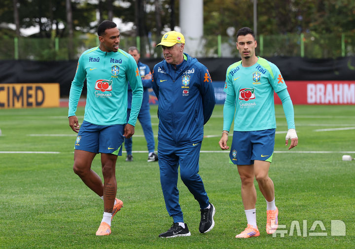 [고양=뉴시스] 김선웅 기자 = 대한민국 축구대표팀과 평가전을 앞둔 브라질 축구대표팀의 카를로 안첼로티 감독이 7일 경기 고양시 고양종합운동장 보조경기장에서 열린 훈련에 참석해 선수들과 이야기를 나누고 있다. 2025.10.07. [email protected]