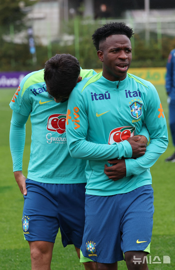 [고양=뉴시스] 김선웅 기자 = 대한민국 축구대표팀과 평가전을 앞둔 브라질 축구대표팀의 비니시우스가 7일 경기 고양시 고양종합운동장 보조경기장에서 훈련에 참여하고 있다. 2025.10.07. [email protected]