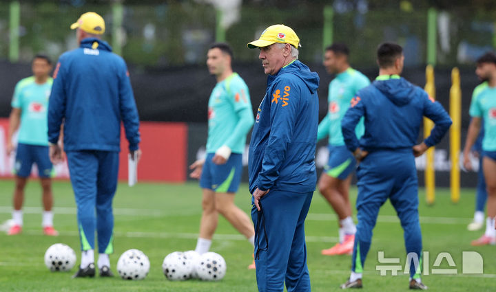 [고양=뉴시스] 김선웅 기자 = 대한민국 축구대표팀과 평가전을 앞둔 브라질 축구대표팀의 카를로 안첼로티 감독이 7일 경기 고양시 고양종합운동장 보조경기장에서 훈련을 지도하고 있다. 2025.10.07. [email protected]