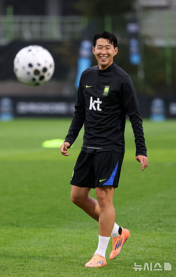 [고양=뉴시스] 김선웅 기자 = 브라질과의 평가전을 앞둔 대한민국 축구대표팀 손흥민이 7일 경기 고양시 고양종합운동장 보조경기장에서 훈련을 하고 있다. 2025.10.07. [email protected]