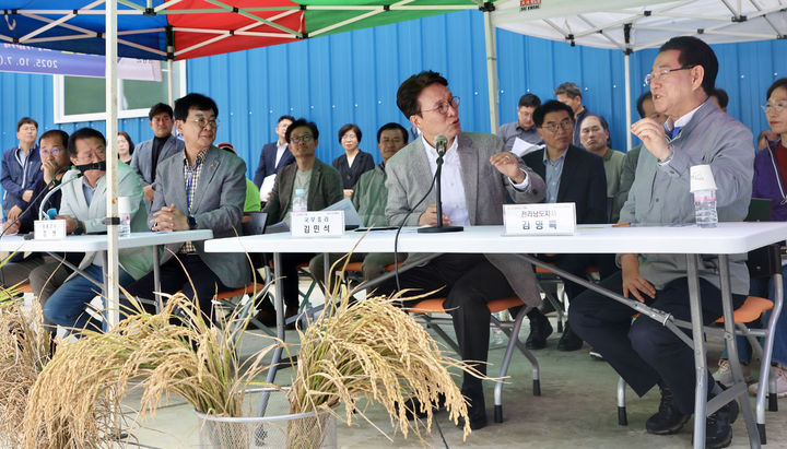 장흥군 벼 깨씨무늬병 피해 현장 찾은 김민석 총리·김영록 전남지사