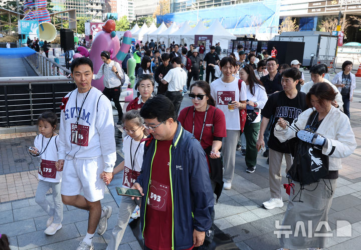 [서울=뉴시스] 배훈식 기자 = 서울거리예술축제 2025가 열린 8일 오전 서울 중구 청계광장에서 아트레킹 참가자들이 청계천 변을 걷고 있다. 2025.10.08. [email protected]