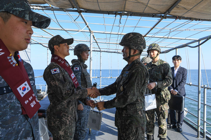 [서울=뉴시스] 조성우 기자 = 진영승 합참의장이 8일 해군 전진기지대를 방문해 서해 최전방 해역 사수를 위한 대비태세를 점검한 뒤 임무 수행 중인 장병들을 격려하고 있다. (사진=합참 제공) 2025.10.08. [email protected] *재판매 및 DB 금지