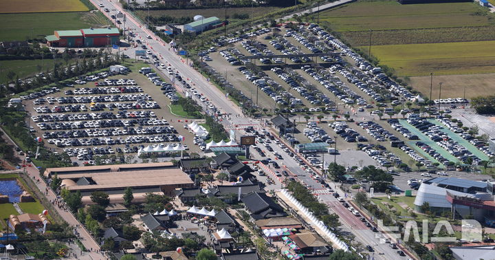 [김제=뉴시스] 김얼 기자 = 추석 연휴 마지막 날인 9일 전북 김제시 벽골제에서 열린 '2025 김제지평선 축제'를 찾은 시민들로 주차장이 북적이고 있다. (사진= 전북사진기자단 공동취재, 항공촬영 협조 = 전북경찰청 항공대장 윤충한 경감, 기장 김인수 경위 , 부기장 장정봉 경위) 2025.10.09. [email protected]