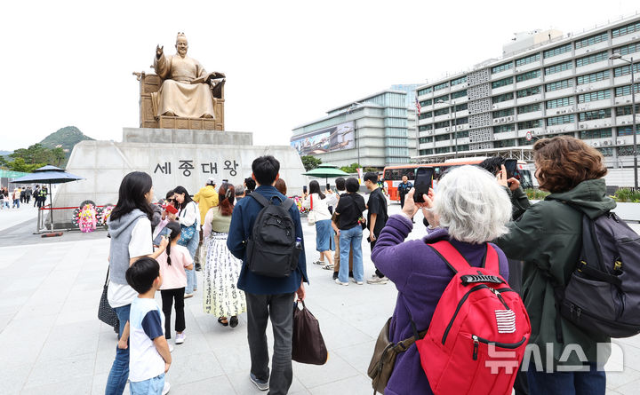[서울=뉴시스] 최진석 기자 = 579돌 한글날인 9일 오전 서울 광화문광장 세종대왕 동상 앞에서 외국인들이 세종대왕 동상을 촬영하고 있다. 2025.10.09. [email protected]
