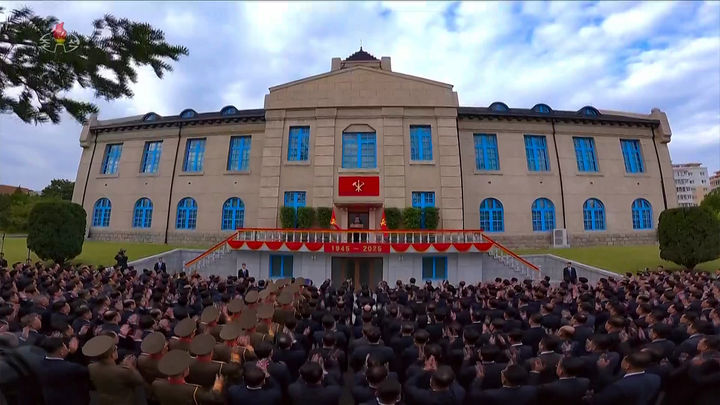 [서울=뉴시스] 김정은 북한 국무위원장이 노동당 창건 80주년 기념일(10월 10일)을 앞둔 8일 평양 해방산거리에 있는 당창건사적관을 찾아 연설했다고 조선중앙통신이 9일 보도했다. (사진=조선중앙TV 캡처) 2025.10.09. [email protected] *재판매 및 DB 금지