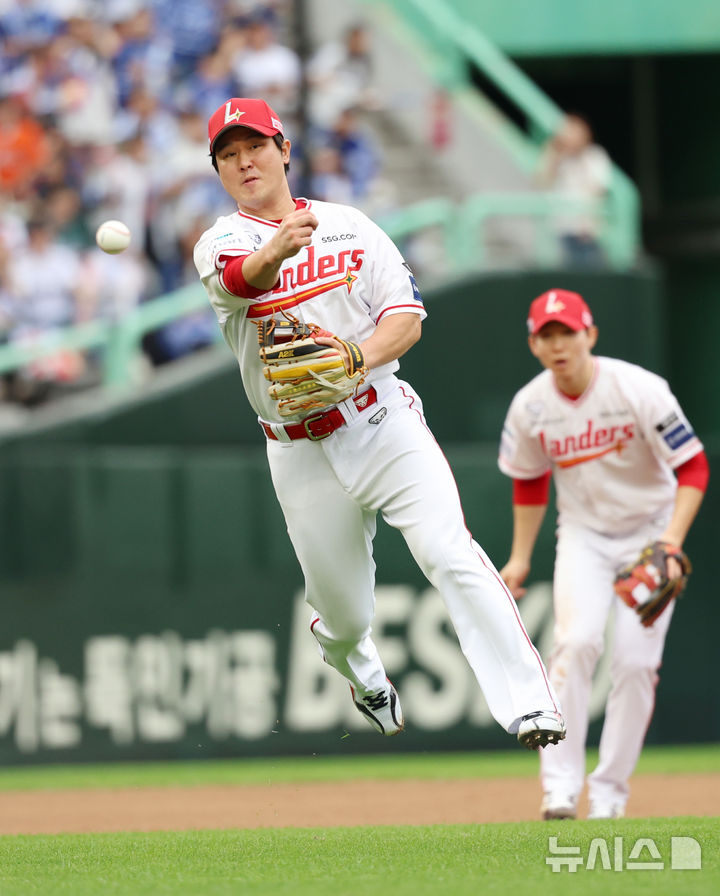 [인천=뉴시스] 조성우 기자 = 9일 인천 미추홀구 SSG랜더스필드에서 열린 2025 KBO 포스트시즌 준플레이오프 1차전 삼성 라이온즈와 SSG 랜더스의 경기, SSG 3루수 최정이 삼성 5회초 공격 선두타자 양도근의 타구를 잡아 1루로 송구해 아웃시키고 있다. 2025.10.09. [email protected]