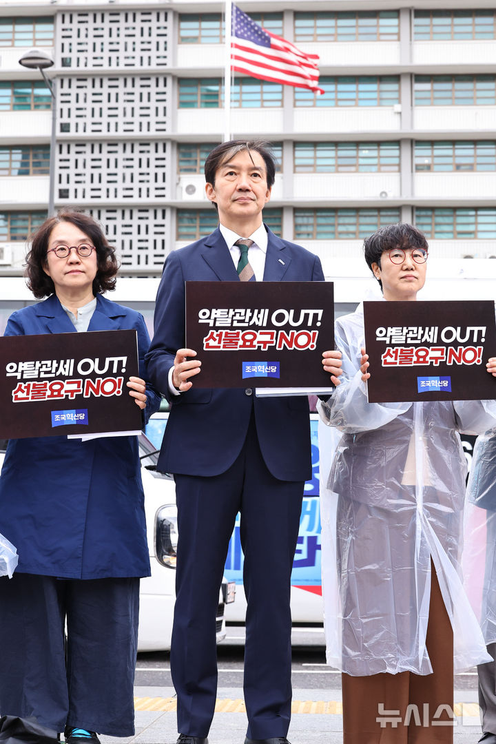 [서울=뉴시스] 최진석 기자 = 조국 조국혁신당비상대책위원장이 9일 서울 종로구 미국대사관 인근에서 '미국의 부당한 관세압박 철회 요구 기자회견'을 하고 있다. 2025.10.09. [email protected]