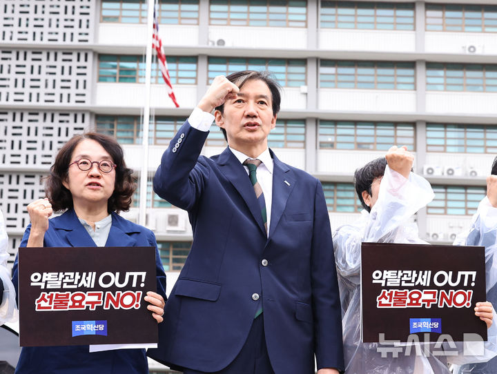 [서울=뉴시스] 최진석 기자 = 조국 조국혁신당비상대책위원장이 9일 서울 종로구 미국대사관 인근에서 열린 '미국의 부당한 관세압박 철회 요구 기자회견'에서 구호를 외치고 있다. 2025.10.09. [email protected]