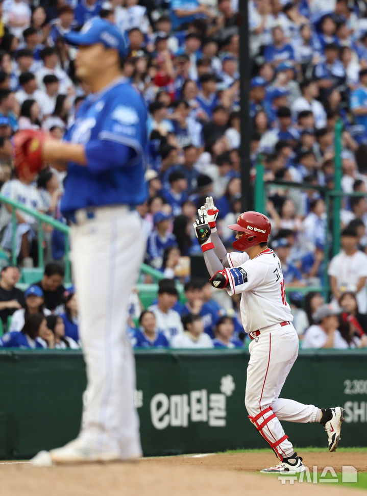 [인천=뉴시스] 조성우 기자 = 9일 인천 미추홀구 SSG랜더스필드에서 열린 2025 KBO 포스트시즌 준플레이오프 1차전 삼성 라이온즈와 SSG 랜더스의 경기, SSG 7회말 공격 1사 주자 1루서 고명준이 2점 홈런을 때린 뒤 그라운드를 돌고 있다. 2025.10.09. [email protected]