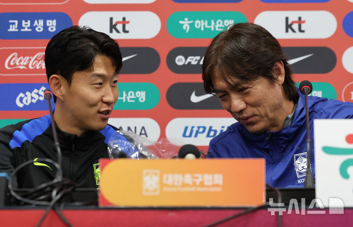 [서울=뉴시스] 권창회 기자 = 브라질과 친선평가전을 앞둔 홍명보 대한민국 축구 국가대표팀 감독과 손흥민이 9일 오후 서울 마포구 상암월드컵경기장에서 열린 공식 기자회견에서 대화를 나누고 있다. 2025.10.09. [email protected]