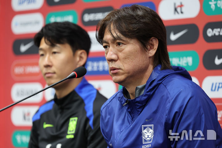 [서울=뉴시스] 권창회 기자 = 브라질과 친선평가전을 앞둔 홍명보 대한민국 축구 국가대표팀 감독이 9일 오후 서울 마포구 상암월드컵경기장에서 열린 공식 기자회견에서 취재진 질문에 답하고 있다. 2025.10.09. [email protected]