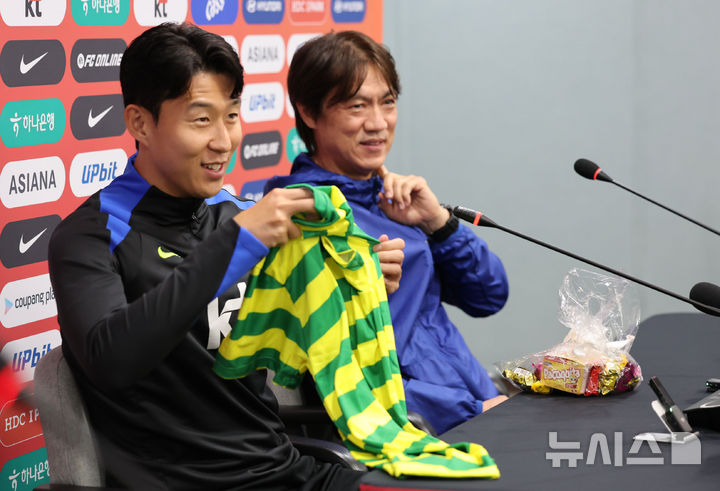 [서울=뉴시스] 권창회 기자 = 브라질과 친선평가전을 앞둔 대한민국 축구 국가대표팀 손흥민이 9일 오후 서울 마포구 상암월드컵경기장에서 열린 공식 기자회견에서 브라질 취재진으로부터 추선선물인 스낵과 옷을 받고 있다. 2025.10.09. [email protected]