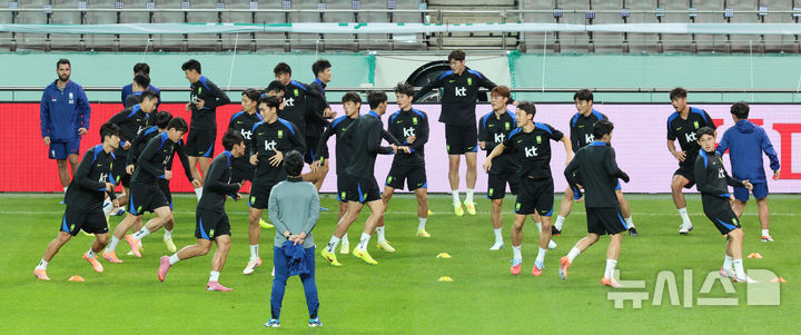 [서울=뉴시스] 권창회 기자 = 브라질과 친선평가전을 앞둔 대한민국 축구 국가대표팀 선수들이 9일 오후 서울 마포구 상암월드컵경기장에서 훈련을 하고 있다. 2025.10.09. [email protected]