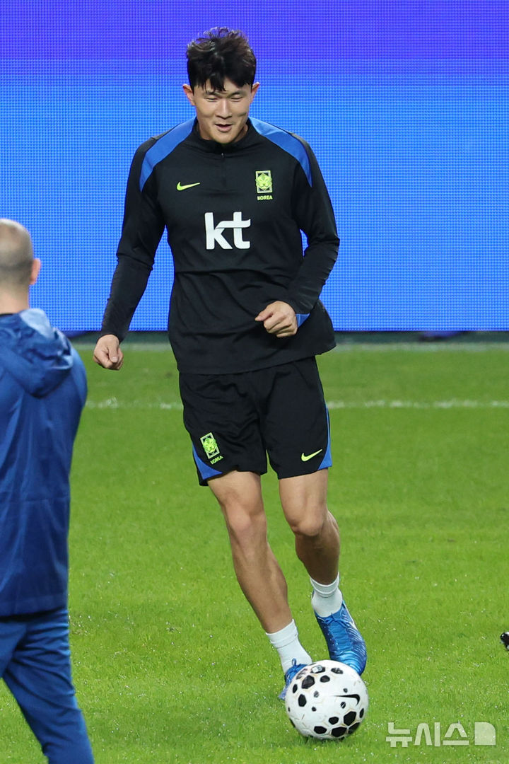 [서울=뉴시스] 권창회 기자 = 브라질과 친선평가전을 앞둔 대한민국 축구 국가대표팀 선수들이 9일 오후 서울 마포구 상암월드컵경기장에서 훈련을 하고 있다. 2025.10.09. [email protected]