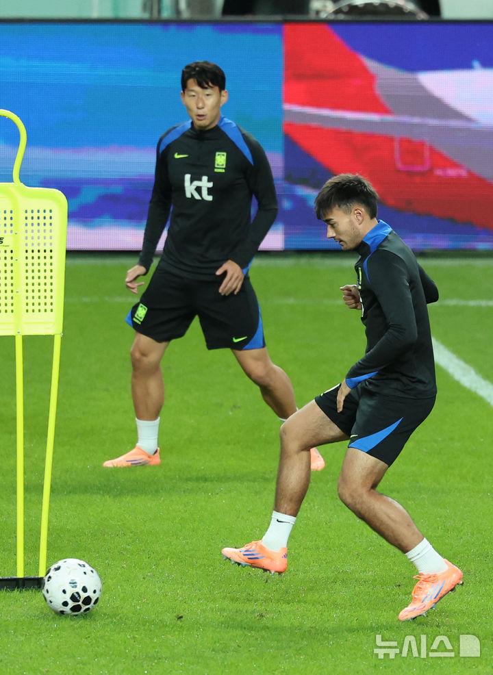 [서울=뉴시스] 권창회 기자 = 브라질과 친선평가전을 앞둔 대한민국 축구 국가대표팀 선수들이 9일 오후 서울 마포구 상암월드컵경기장에서 훈련을 하고 있다. 2025.10.09. [email protected]