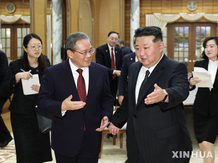 [평양=신화/뉴시스] 김정은(오른쪽) 북한 국무위원장이 9일 북한 평양에서 리창 중국 총리를 만나고 있다. 리 총리는 북한 조선노동당 창당 80주년 열병식 참석을 위해 북한을 방문했다. 2025.10.10.