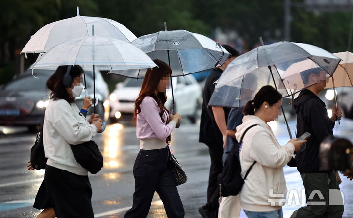 [서울=뉴시스] 최진석 기자 = 서울을 비롯한 수도권 곳곳에 비가 내리고 있는 10일 서울 종로구 세종대로 사거리에서 시민들이 우산을 쓰고 발걸음을 재촉하고 있다. 2025.10.10. [email protected]