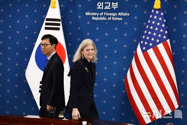 [서울=뉴시스] 김명원 기자 = 박윤주(왼쪽) 외교부 1차관과 앨리슨 후커(Allison Hooker) 미 국무부 정무차관이 10일 서울 종로구 외교부에서 열린 한미 외교차관 전략대화에 앞서 악수후 자리로 이동하고 있다. (공동취재) 2025.10.10. [email protected]