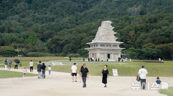 [익산=뉴시스] 김얼 기자 = 완연한 가을 날씨가 이어지고 있는 10일 전북 익산시 미륵사지를 찾은 시민들이 석탑을 관람하며 가을의 정취를 느끼고 있다. 2025.10.10. [email protected]