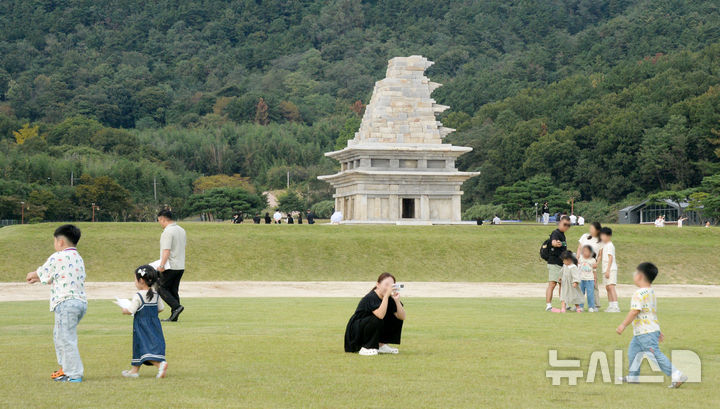[익산=뉴시스] 김얼 기자 = 완연한 가을 날씨가 이어지고 있는 10일 전북 익산시 미륵사지를 찾은 시민들이 석탑을 관람하며 가을의 정취를 느끼고 있다. 2025.10.10. [email protected]