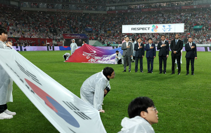 [서울=뉴시스] 정병혁 기자 = 최휘영 문화체육관광부 장관이 10일 서울 마포구 서울월드컵경기장에서 열린 한국과 브라질의 남자 축구 국가대표 평가전에 앞서 국기에 대한 경례를 하고 있다.(사진=문화체육관광부 제공) 2025.10.10. [email protected] *재판매 및 DB 금지