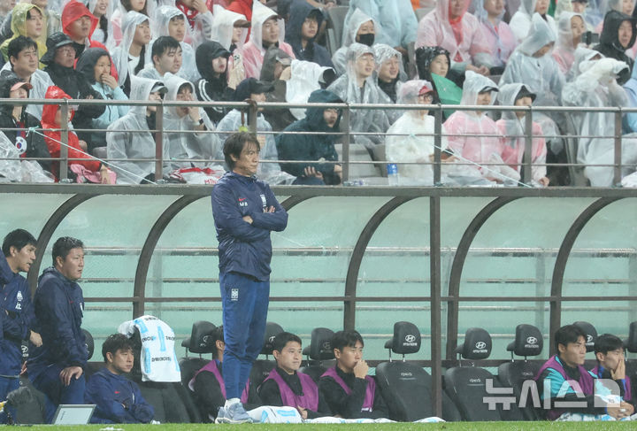[서울=뉴시스] 황준선 기자 = 10일 서울 마포구 서울월드컵경기장에서 열린 남자 축구 국가대표 10월 A매치 친선전 대한민국과 브라질의 경기, 전반 한국 홍명보 감독이 경기를 지켜보고 있다. 2025.10.10. [email protected]
