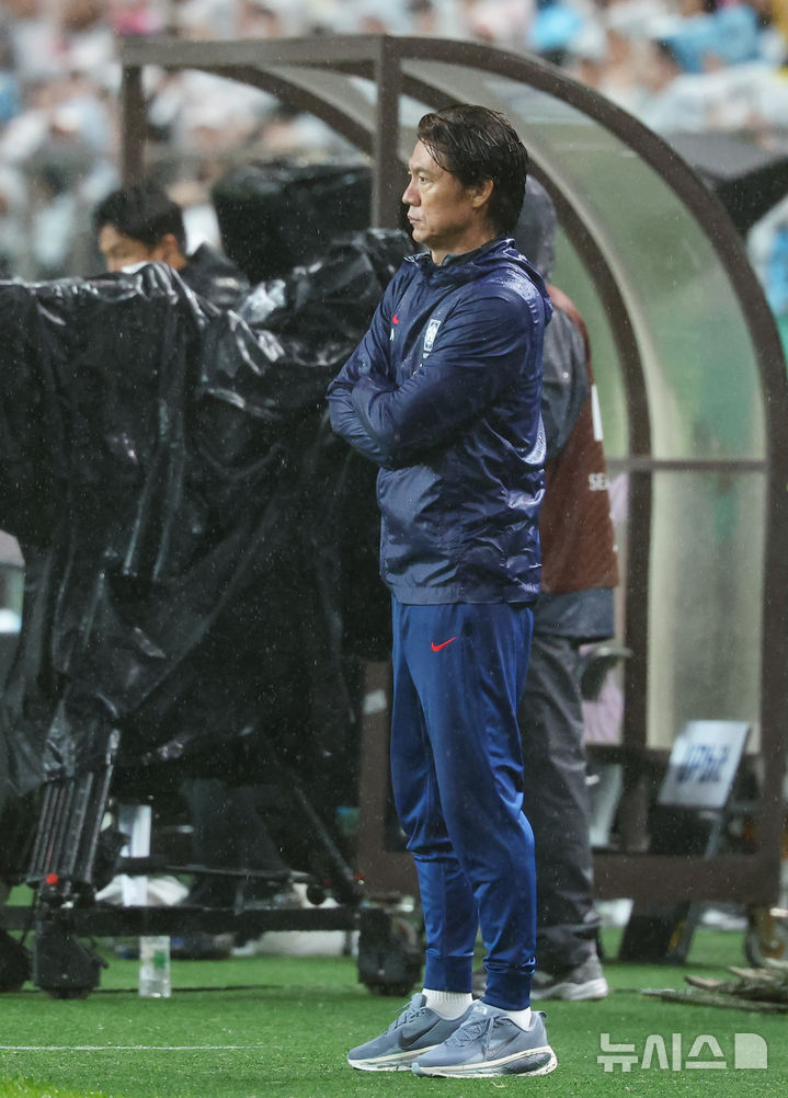 [서울=뉴시스] 황준선 기자 = 10일 서울 마포구 서울월드컵경기장에서 열린 남자 축구 국가대표 10월 A매치 친선전 대한민국과 브라질의 경기, 후반 한국 홍명보 감독이 경기를 지켜보고 있다. 2025.10.10. [email protected]