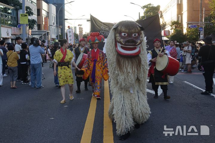 [제주=뉴시스] 양영전 기자 = 제64회 탐라문화제 2일차인 11일 오후 제주시 관덕정 인근 도로에서 탐라퍼레이드가 진행되고 있다. 2025.10.11. [email protected]