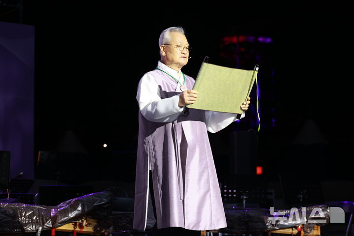 [영동=뉴시스] 11일 오후 2025영동세계국악엑스포 공동조직위원장으로 활동한 윤영달 크라운해태 회장이 영동군 영동읍 매천리 엑스포 주무대에서 미래 비전 '국악문화도시 No1 영동'을 선포하면서 국악의 세계화 필요성을 강조하고 있다. (사진=영동군 제공) 2025.10.11. [email protected]