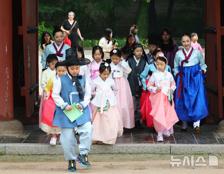 [서울=뉴시스] 박주성 기자 = 11일 오전 서울 중구 덕수궁에서 가을 궁중문화축전의 일환으로 열린 준명당 어린이 학교에서 참가한 어린이들이 한복을 입고 궁을 걸어보고 있다.