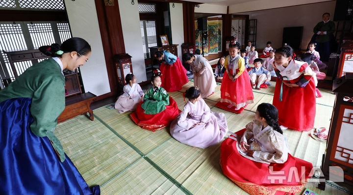 [서울=뉴시스] 박주성 기자 = 11일 오전 서울 중구 덕수궁에서 가을 궁중문화축전의 일환으로 열린 준명당 어린이 학교에서 참가한 어린이들이 궁중 예절을 배우고 있다.