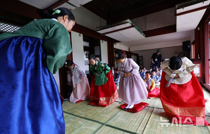 [서울=뉴시스] 박주성 기자 = 11일 오전 서울 중구 덕수궁에서 가을 궁중문화축전의 일환으로 열린 준명당 어린이 학교에서 참가한 어린이들이 궁중 예절을 배우고 있다.
