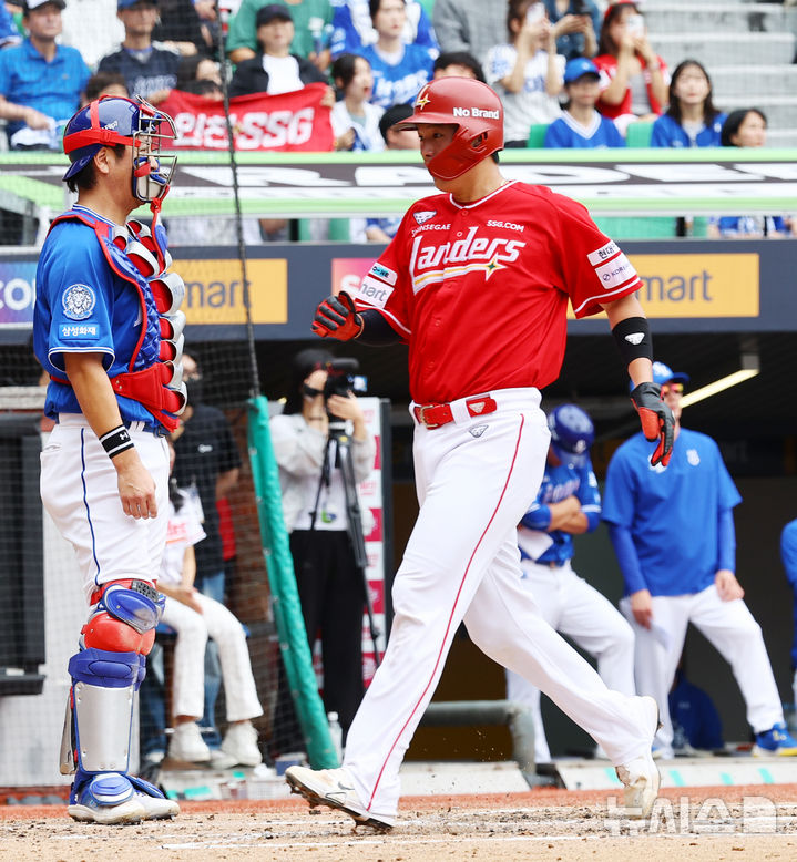 [서울=뉴시스] 박주성 기자 = 11일 인천 미추홀구 SSG랜더스필드에서 열린 2025 KBO 포스트시즌 준플레이오프 2차전 삼성 라이온즈와 SSG 랜더스의 경기, 3회말 투아웃 주자 2루에서 SSG 최정이 1타점 적시타 때 2루에 있던 주자 조형우가 홈을 밟고 있다. 2025.10.11. [email protected]
