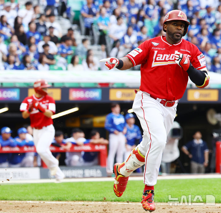 [서울=뉴시스] 박주성 기자 = 11일 인천 미추홀구 SSG랜더스필드에서 열린 2025 KBO 포스트시즌 준플레이오프 2차전 삼성 라이온즈와 SSG 랜더스의 경기, 5회말 투아웃 주자 3루에서 SSG 에레디아가 1타점 적시타를 치고 있다. 2025.10.11. [email protected]