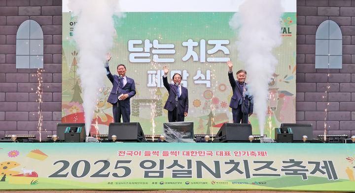 [임실=뉴시스] 김종효 기자 = '2025 임실N치즈축제' 마지막 날인 5일 폐막식에서 심민 군수(가운ㄷ), 장종민 군의장(왼쪽), 문영두 치즈테마파크원장(오른쪽)이 축제를 찾아온 관광객들에게 폐막 인사를 하고 있다. (사진=임실군 제공) 2025.10.12. [email protected]