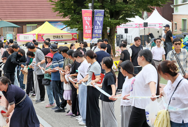 [임실=뉴시스] 김종효 기자 = '2025 임실N치즈축제' 마지막 날인 5일, 축제 프로그램인 ‘쭉쭉 늘려 내 치즈’에 참여한 관광객들이 치즈를 늘리고자 길게 줄을 선 모습이다. (사진=임실군 제공) 2025.10.12. [email protected]