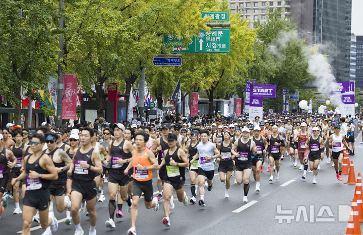 [서울=뉴시스] 김근수 기자 = 12일 오전 서울 종로구 세종대로에서 열린 '2025 서울레이스 마라톤’에서 하프부문 참가자들이 출발선에서 출발하고 있다. 2025.10.12. [email protected]