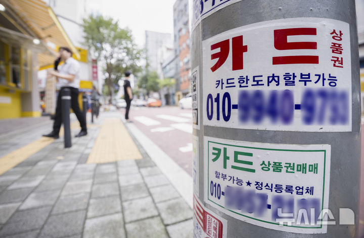 [서울=뉴시스] 김근수 기자 = 12일 서울 시내의 한 음식점 거리에 놓인 가로등에 카드 대출 안내문이 붙어 있다.