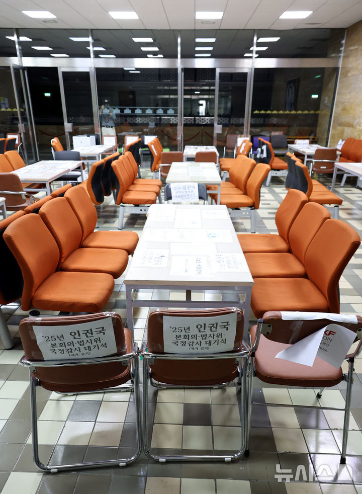 [서울=뉴시스] 김금보 기자 = 2025년 국정감사를 하루 앞둔 12일 서울 여의도 국회에 마련된 법제사법위원회 피감기관 대기 공간에 자리 선점을 위해 미리 붙여둔 기관명 표지가 붙어 있다. 2025.10.12. [email protected]
