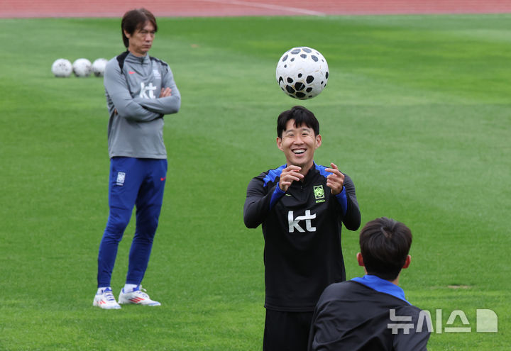 [고양=뉴시스] 김진아 기자 = 대한민국 축구대표팀 손흥민과 선수들이 12일 경기 고양종합운동장 보조구장에서 파라과이전 대비 훈련을 하자 홍명보 감독이 지켜보고 있다. 2025.10.12. [email protected]