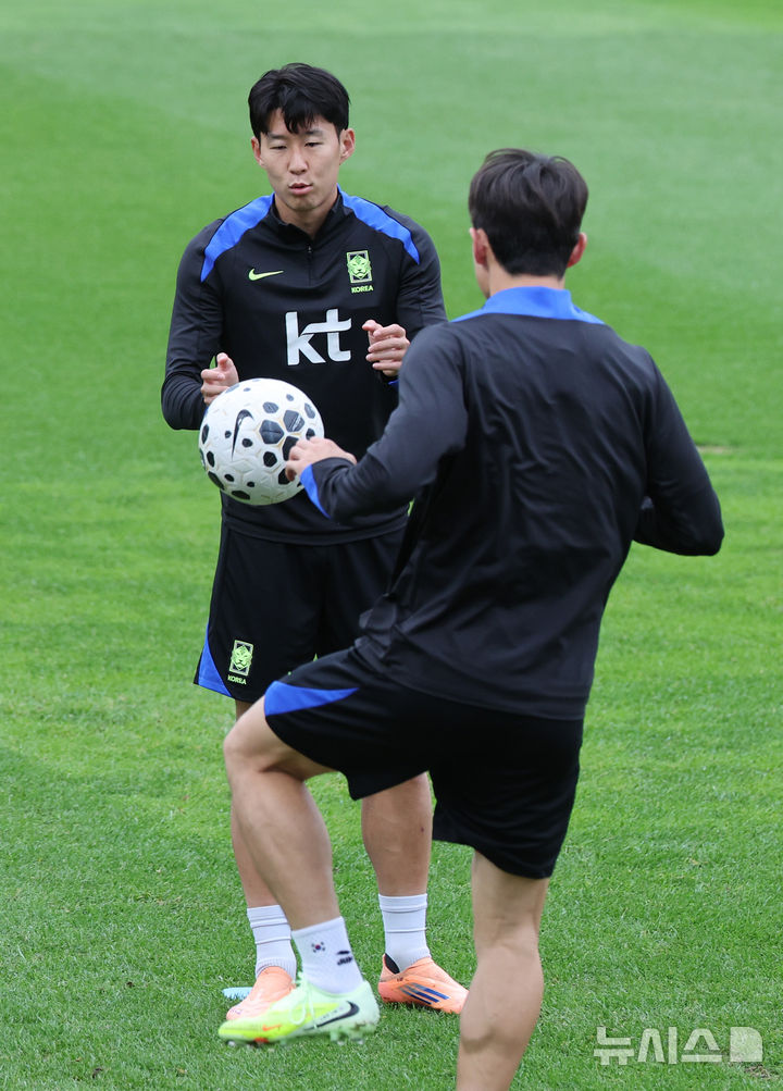 [고양=뉴시스] 김진아 기자 = 대한민국 축구대표팀 손흥민과 선수들이 12일 경기 고양종합운동장 보조구장에서 파라과이전 대비 훈련을 하고 있다. 2025.10.12. [email protected]
