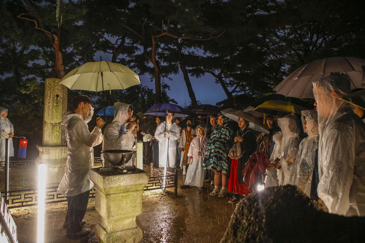[서울=뉴시스] 김진아 기자 = 11일 서울 창경궁에서 열린 조선시대 천문관측유산으로 궁궐 속 과학 이야기를 다룬 프로그램 '조선의 밤, 하늘과 바람'에서 관람객들이 과학 크리에이터 항성과 엑소의 해설을 듣고 있다. (사진=국가유산진흥원 제공) 2025.10.12. [email protected] *재판매 및 DB 금지