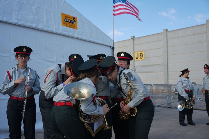 [텔아비브=AP/뉴시스] 13일(현지 시간) 이스라엘 텔아비브 인근 벤구리온 공항에서 도널드 트럼프 미국 대통령의 도착 환영식을 준비하던 이스라엘 군악대 대원들이 가자지구에서 풀려난 이스라엘 인질들의 석방 소식을, 휴대전화를 통해 생중계로 듣고 있다. 2025.10.13.