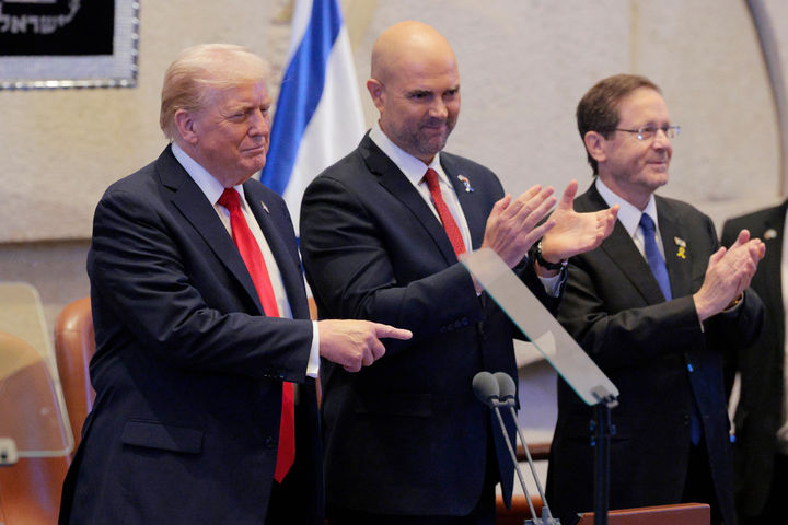 [예루살렘=AP/뉴시스]도널드 트럼프 미 대통령이 13일 예루살렘의 이스라엘 의회 크네셋에서 연설하기 전 기립박수를 받고 있다. 그는 이날 모든 이스라엘 인질들이 석방된 것과 관련, "새로운 중동의 역사적 새벽"을 선언했다. 2025.10.13.