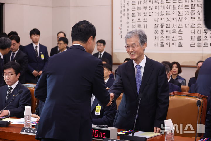 [서울=뉴시스] 고승민 기자 = 조희대 대법원장이 13일 서울 여의도 국회에서 열린 법제사법위원회의 대법원 등 국정감사에서 시작 전 인사 온 장동혁 국민의힘 대표와 악수하고 있다. 2025.10.13. [email protected]